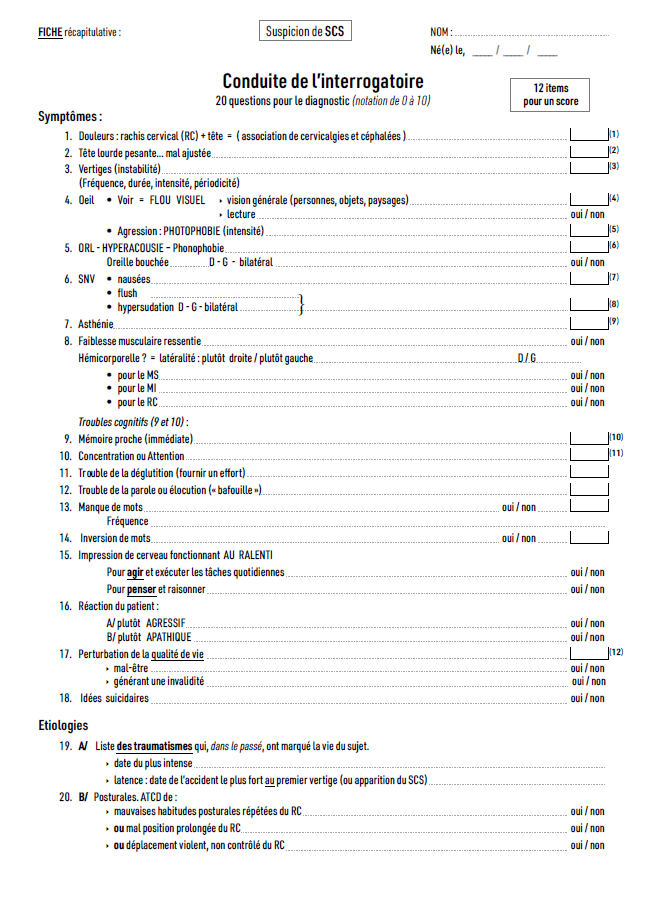 Dans le SCS, les symptômes sont tous présents à des degrés divers, et ils seront quantifiés et intégrés dans un score global. Les symptômes, bien que disparates, sont tous liés dans le SCS, puisqu’ils seront simultanément améliorés par une seule méthode thérapeutique manuelle inédite, appliquée à la première vertèbre cervicale (échec des traitements médicamenteux et kinésithérapiques conventionnels).