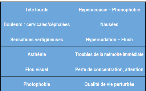 Plus rarement, ils présentent des acouphènes, qui concernent plutôt l’oreille interne et ne font pas partie du syndrome. On notera cependant que des acouphènes apparus après le traumatisme ont disparu suite à notre traitement spécifique, mais cela reste exceptionnel.
