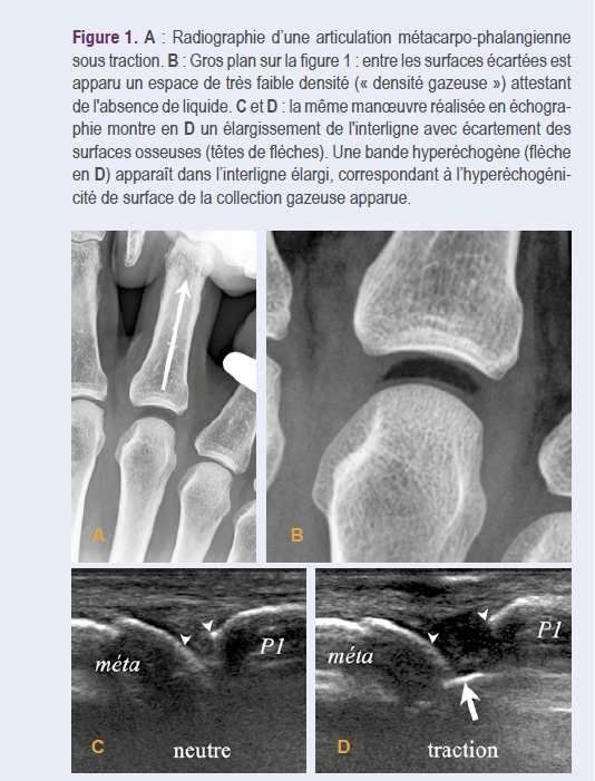 On peut typiquement créer cette situation par une manoeuvre de traction sur une articulation métacarpo-phalangienne normale, exempte d’épanchement liquidien, pour autant que l’articulation soit suffisamment laxe pour être séparée8. C’est même par cette manoeuvre que la première