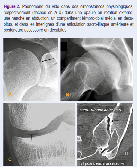 Un phénomène du vide dans l’interligne articulaire d’une articulation normale est donc une situation non exceptionnelle, quand cette articulation est mise dans une position tendant à écarter ses berges, par exemple dans des épaules en rotation externe, des hanches en abduction, des articulations sacro-iliaques en décubitus, des articulations fémoro-tibiales médiales un peu laxes en décubitus (Figure 2).