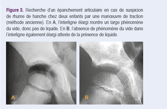 - la radiographie de la hanche sous traction a été, avant ’apparition de l’échographie, utilisée chez l’enfant pour établir le diagnostic d’épanchement intra-articulaire dans le cadre des « rhumes de hanches ». Si les surfaces articulaires s’écartent nettement, soit il se produit un phénomène du vide (= pas d’épanchement), soit l’interligne élargi n’en présente pas (= présence d’un épanchement)