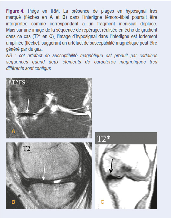 - dans le genou, un phénomène du vide -pas très fréquent- peut être observé essentiellement dans le compartiment fémoro tibial médial en décubitus (Figure 2c). Dans des articulations compartimentées comme le genou, un phénomène du vide unicompartimental n’exclut pas la présence d’un épanchement dans d’autres compartiments7. Ce vide dans l’interligne articulaire peut, en IRM, être interprété erronément comme fragment méniscal déplacé18,19. Ce piège peut être reconnu par l’aspect beaucoup plus grossier de cette plage sur des séquences en écho de gradient, en raison de l’artéfact de susceptibilité magnétique19. Il peut être utile dans ce cas de regarder les images des séquences de repérage, souvent réalisées en écho de gradient (Figure 4).