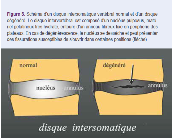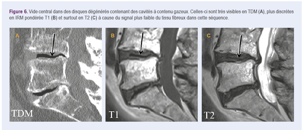 Un phénomène du vide y est visible chez 20 % des sujets âgés20, davantage sur des clichés en extension (34 % debout en position neutre dans une série de lombalgiques et 46 % sur des clichés en extension)21. Le vide peut se situer dans la partie centrale du disque, résultant de fentes liées à une dégénérescence du nucleus pulposus. Quand la dégénérescence discale progresse, les fentes peuvent s’étendre dans l’anneau fibreux et même à la totalité de l’espace intersomatique (Figures 5 et 6).
