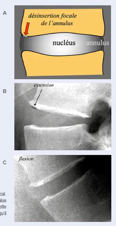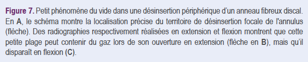 Un second site fréquent de phénomènes du vide est situé dans des interruptions de fibres de l’anneau fibreux au niveau de leur insertion sur le plateau vertébral (fibres de Sharpey), très souvent même en l’absence de pathologie du nucléus pulposus. Les phénomènes du vide dans ce territoire ont l’aspect de fines collections gazeuses linéaires accolées au plateau vertébral à proximité de sa marge antérieure et apparaissent plus fréquemment sur des clichés en extension (Figure 7).