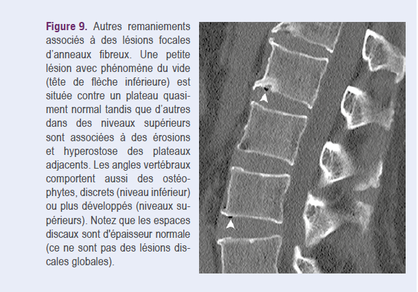 Ces lésions focales de l’anneau fibreux peuvent s’accompagner d’ostéophytes marginaux20, de petites érosions osseuses superficielles et de modifications focales de la moelle osseuse adjacente, visibles en IRM, de type oedémateux ou hypergraisseux22 (Figures 8 et 9). Il ne faut pas les prendre pour des lésions de spondylite inflammatoire (c’est important !) qui sont généralement plus étendues, plus nombreuses et portent davantage sur la face antérieure de l’angle vertébral que sur le plateau, ainsi que sur des localisations non antérieures.