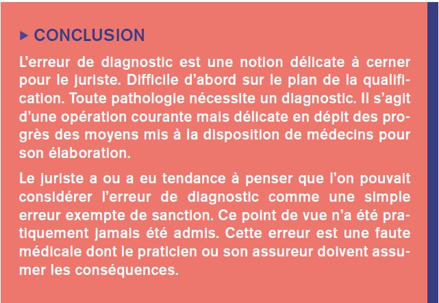On pourrait estimer que le diagnostic erroné constituerait une simple erreur et non une faute médicale engageant une responsabilité du praticien et une indemnisation du patient s’il y a lieu. Cette distinction ne peut être retenue. Outre qu’il est difficile et quasi impossible de qualifier de simple erreur et non de faute, une erreur qui peut être lourde de conséquences. On peut lire sur cette question l’excellente thèse du professeur Jean Penneau titulaire d’une double expérience de médecin et professeur de droit (p.146 et sts).